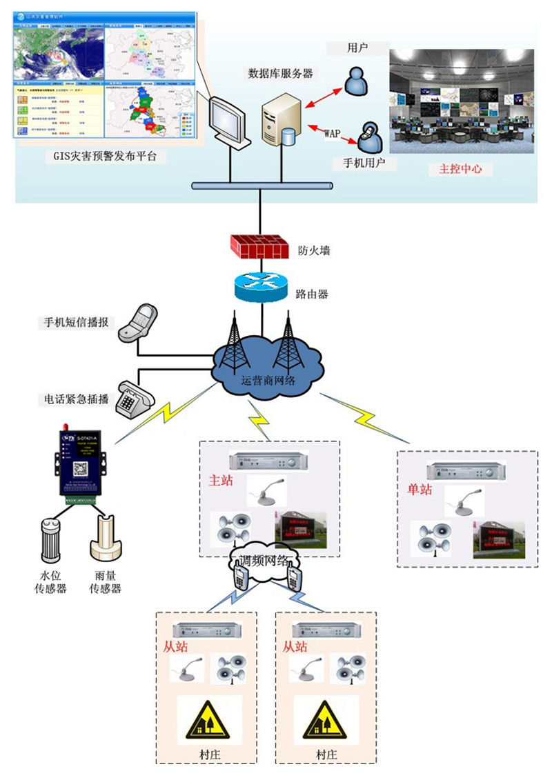 山洪监测系统由雨量传感器、震动感应器、压力感应器、摄像头、GPS位移精准测量仪等工程设备和中心站组成。系统采用的以自动监测为主,人工监测为辅的灵活山洪灾害监测,系统利用运营商网络,雨量传感器、震动感应器、压力感应器、摄像头、GPS位移精准测量仪可实时自动上报的功能。也可使用智能山洪滑坡监测软件对多个监测点实时数据的远程接收、存储、配置、召测及系统管理。