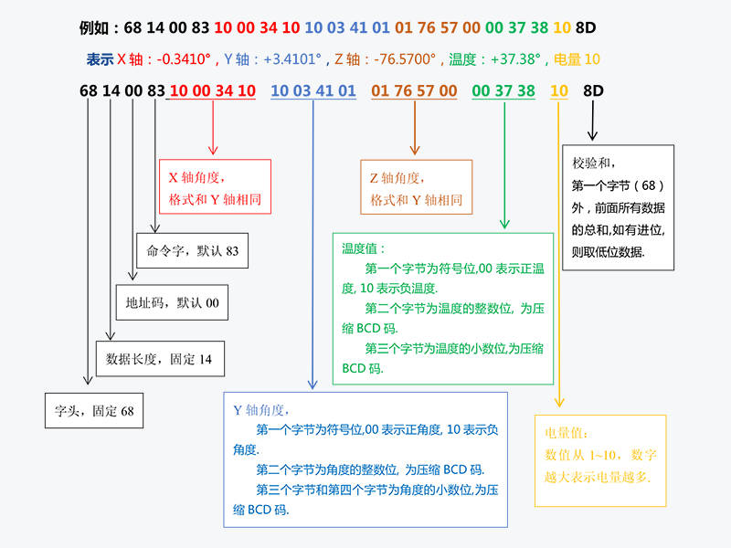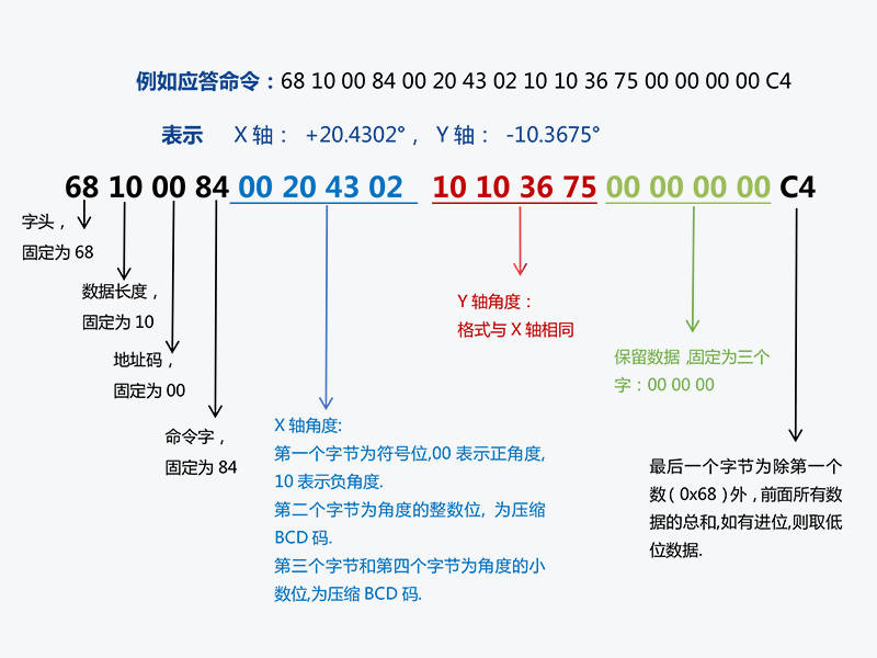 | 标示符 | 数据长度 | 地址码 | 命令字 | 数据域 | 校验和 |