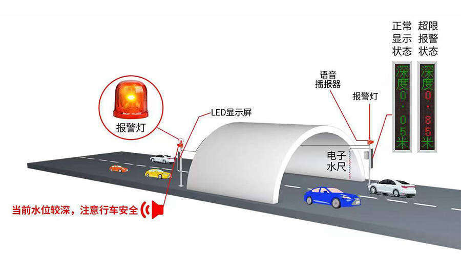 尺寸102CM*22CM双色屏,红绿双色屏。单元板点阵数为16*96,显示方式为竖直显示,远程遥测终端主机RTU与LED字库卡通讯正常状态:显示内容为“当前积水深度0.35米”,可滚动显示汉字部分显示绿色,数字部分正常显示绿色,超限显示红色。远程遥测终端主机RTU与LED字库卡通讯异常状态:LED屏数字部分会显示红色横杠----。远程遥测终端主机RTU与电子水尺主机通讯异常状态:LED屏数字部分会显示红色“0.00”。设备默认带一个LED双色显示屏,如果需要桥洞双向报警显示可根据实际需要在增配一个LED双色显示屏。双向车道入口处LED屏显示实时涵洞水位,积水超过设定阈值,双向车道均可声光报警同时语音播报“当前水位较深,注意行车安全“。