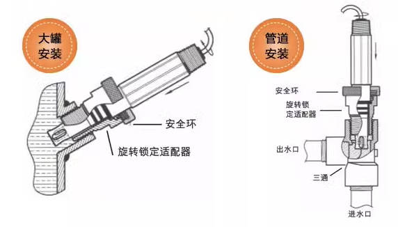 另一种常用的是"旋转锁定式“,我们可提供同样可用于浸泡式测量的带有”¾NPT和1” NPT螺纹的型号。旋转锁定式安装及拆卸清洗都很简单。只需转1/4圈即可将传感器安装到适配器上或拆卸下来。另外,我们还可提供装到适配器项部的安全环,可防止用户没有完全将电极旋到位并锁定而造成的不安全。