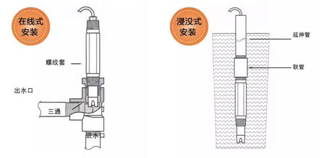 水质传感器有几种类型的工业电极,都有特定的连接功能。最常见的是 在线/浸没式,我们可提供带有½¾°1"和 1½NPT螺纹的型号。建议此类传感器用于如下用途: