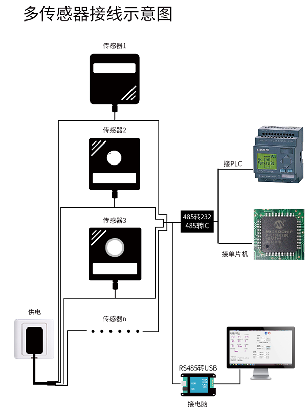 本传感器可以连接单独使用,首先使用12V直流电源供电,设备可以直接连接带有485接口的PLC,可以通过485接口芯片连接单片机。通过后文指定的modbus协议对单片机和PLC进行编程即可配合传感器使用。同时使用USB转485即可与电脑连接,使用我公司提供的传感器配置工具进行配置和测试。