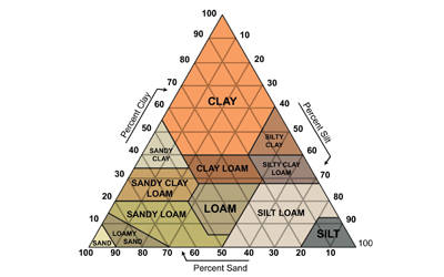 农业部定义了十二种主要的土壤质地分类。十二类是砂、壤土、砂壤土、壤土、粉砂壤土、粉砂、砂质粘壤土、粘壤土、粉质粘壤土、砂质粘土、粉质粘土和粘土。土壤质地按土壤中存在的每种土壤成分(沙子、淤泥、粘土)的分数进行分类。分类通常以主要成分粒度或最丰富粒度的组合命名,例如“砂质粘土”或“粉质粘土”。第四个术语,壤土,用于描述土壤样品中沙子、淤泥和粘土的相同特性,并有助于命名更多分类,例如“粘土壤土”或“粉砂壤土”。